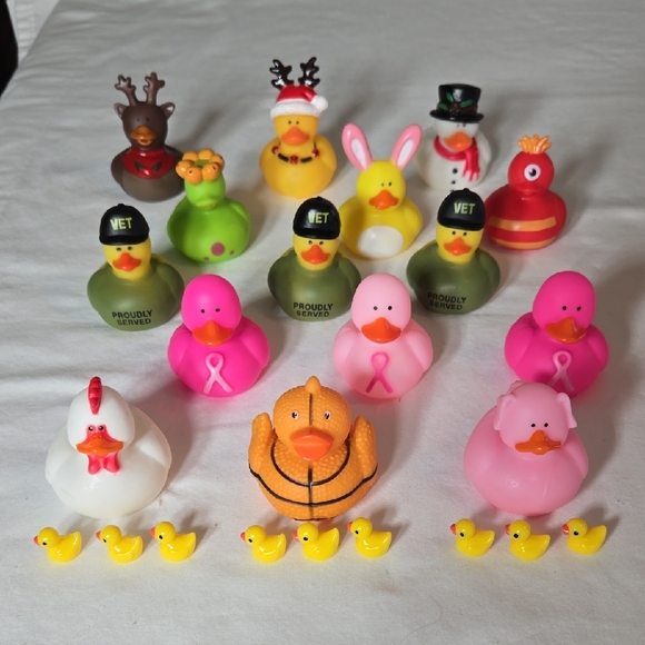 New ducks that include Christmas, Monsters, Easter Bunny, Proud Vet, Breast Cancer, Chicken and Pig, and Basketball. Those 15 are rubber, but do not float. I thought my jeep-owning husband would give these to other jeep owners, but someone gifted him a micro duck, so that's all he carries around now. I've included nine of the plastic micro ducks.