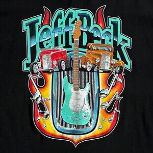 A rare find from Jeff Beck's 2001 tour. Beck was a famous "Gear Head" and this vibrant classic art shows his love for Hot Rods & Guitars. Flame Sleeves. This tee is gently worn. Size XL measures 22.5" x 31.5"
