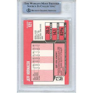 Phoenix Suns 1989-1990 Fleer Basketball trading Card #121, hand signed by 1991 NBA All Star Game selection Jeff Hornacek. Jeff Hornacek signed the trading card in silver sharpie. This sig is a clean, well placed signature that really pops nicely off of this collectible, which has been authenticated and encapsulated by Beckett Authentication Services (BAS) Beckett Autograph Authentication Number: 00014390727.