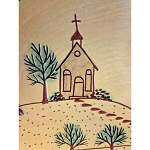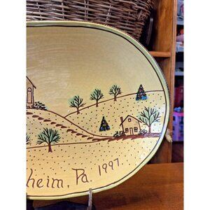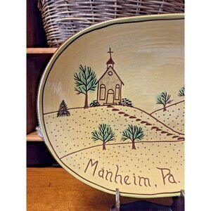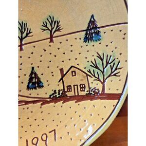 This handcrafted redware pottery plate was created by Jeff White of Lebanon, Pennsylvania, a respected maker of traditional Pennsylvania Dutch-style folk art pottery. Dated 1997 and inscribed for Manheim, PA, the plate features a warm golden slip ground with a hand-painted primitive country scene showing a church on a hill, scattered trees, and a homestead — a classic nod to Lancaster County traditions.