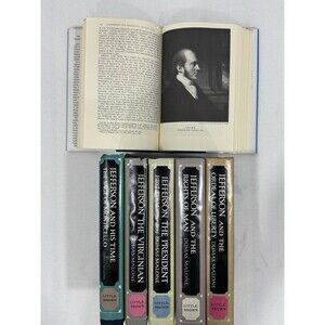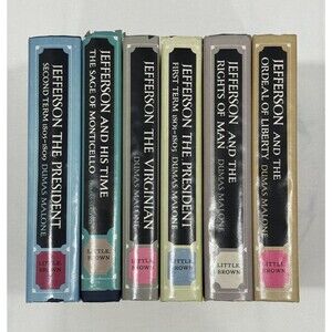 The product is a complete 6-volume set of the book "Jefferson and His Time" by Dumas Malone. It is a nonfiction historical narrative focusing on US history, specifically covering the life and times of Thomas Jefferson. Published by Little Brown and Company, the hardcover set includes dust jackets and is written in English. This comprehensive series offers in-depth analysis and insights into one of the most pivotal figures in American history.