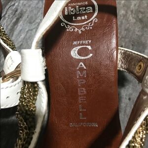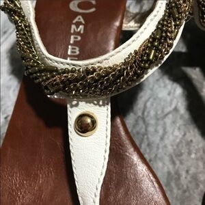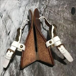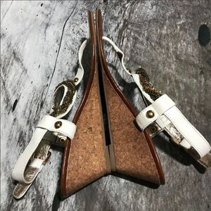 White sandals with gold chain detailing and accents. EUC. Heel is approximately 2.5” cork wedge.