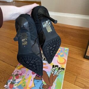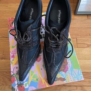 Super cute ankle bootie heels from Jeffery Campbell, never worn out of the house the distressed look is how they are made/come. I would say they fit pretty true to size but the pointed toe can make it a bit tight on the toes. Comes in original box!