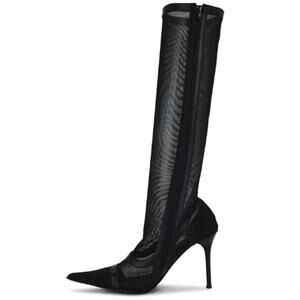 Keywords: Jeffrey Campbell mesh boots, black stiletto boots, high shaft mesh heels, pointed toe designer boot, size 7 fashion boots, edgy runway shoes