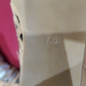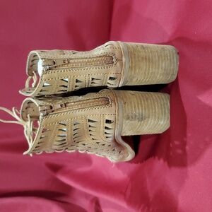 good used condition some rubbing on heels tan leather laser cut peep toes heeled shoes by Jeffrey Campbell size 7.5