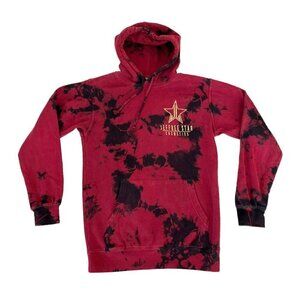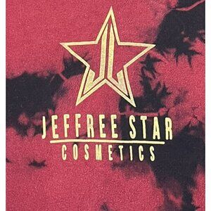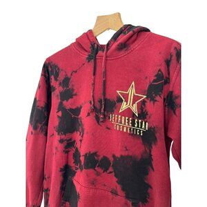 Jeffree Star Fashion men's red and black tie dye pullover sweatshirt. Sweatshirt has a front kangaroo pocket and a shiny gold star logo that says "Jeffree Star Cosmetics." It's made of a cotton poly blend and is a man's size small.