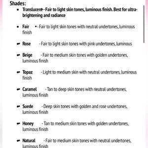 Translucent - Fair to light skin tones, luminous finish. Best for ultra-brightening and radiance
