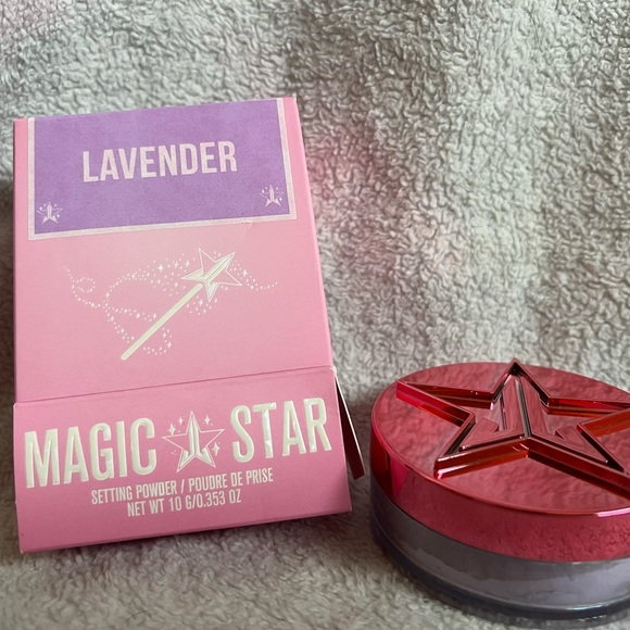 Achieve a flawless look with Jeffree Star's Magic Star Lavender Setting Powder. Features a vibrant red lid and pink packaging. Ideal for a smooth, long-lasting finish. Never used