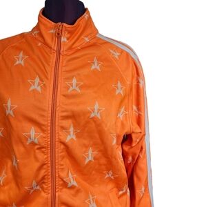 Features Jeffree Star cosmetics 2 piece track suit in neon orange adorned in white Jeffree Star star logos, full zipper fleece lined track jacket, mock neck, long sleeve with ribbed cuffs and white double varsity stripes, 2 side slip pockets, matching jogger fleece lined track pants with double white varsity stripes, elastic bottom hem, back welt pocket, elastic waistband with drawstring.