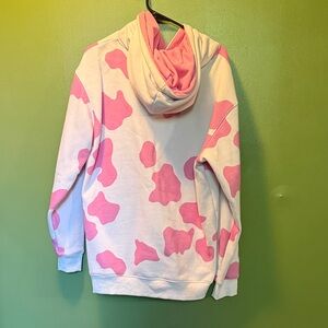 Stylish hoodie with a pink and white cow print design. Perfect for casual wear. Heavy duty sweatshirt for the winter months. pit to pit is 23 inches length is 29 inches.
