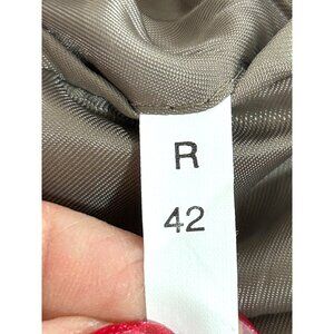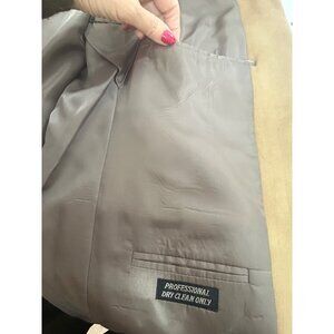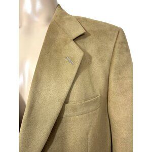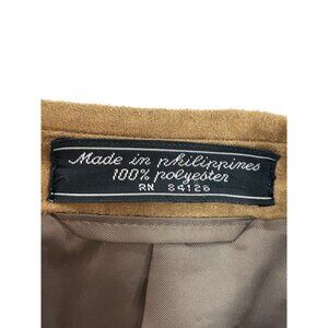 0409B- Jeffrey Banks Men’s Vintage blazer sport jacket/sports coat , 42R, golden brown, 100% polyester RN 84126. Feels like suede, soft, smooth, made in the Philippines. Single breasted 2-button. Two front pockets with fold over flaps. Left breast pocket, three buttons at wrist. Lined. Vented back; three inside slot pockets, two on left side, one on right. Shoulder pads.