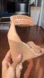 The color is somewhere between tan peach and beige. They’re super comfortable leather sandals.. Very easy and comfortable to walk in because they wrap around the ankle. Zipper entry for your foot. Worn a few times so the only noticeable wear is on the back of the heel.