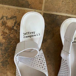 Lovely, like new white sling backs by Jeffrey Campbell. Genuine Leather Upper. Heel height is 1.75 approximately. Worn once. Pictures are part of description.