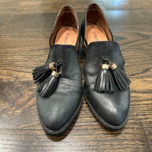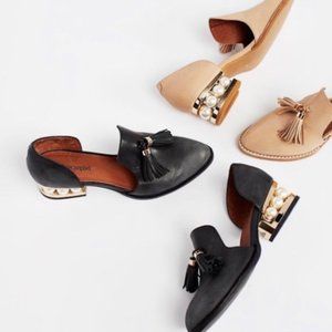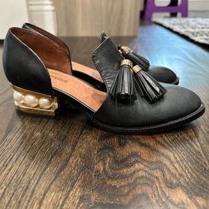 Jeffrey Campbell Pearl Heel Loafer with tassel details. SOLD OUT EVERYWHERE. These shoes are so on trend and will certainly standout from the crowd. Featuring a pearl heel with gold accents.