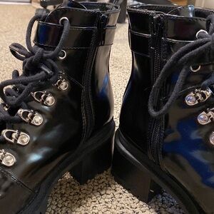 Awesome boots! Edgy and fun. Side zippers for easy on and off. Buckle and lace up in the front. Thick sole and heel. Small scuff mark on the right shoe. Great for the fall and winter.