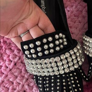 Chic black heels adorned with silver studs and sparkling rhinestones. Ideal for glamorous events.