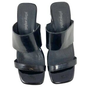 Jeffrey Campbell Black Slide Wedge Sandals - Size 7. Patent leather upper. Leather lining and cushioned insole. Rubber sole. Made in China.