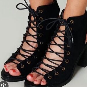 Jeffrey Campbell Black Suede Leather Block Heel Lace-up Pattern Bootie