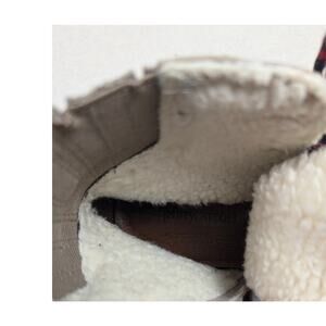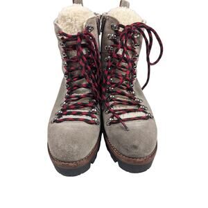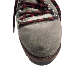These Jeffrey Campbell hiker boots in size 8 are perfect for outdoor enthusiasts and anyone seeking durable, stylish footwear. The boots feature a rugged suede exterior and cozy shearling lining, ensuring warmth and comfort in cold weather. The red and black plaid laces add a pop of color, while the sturdy lug sole provides excellent traction on various surfaces. They have an approximate 1.5-inch heel and stand about 8 inches tall from the sole to the top of the shaft. The side zipper ensures easy on and off wear.