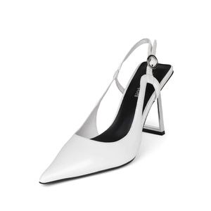 Pointed-toe slingback pump with sculpted cutout heel.
