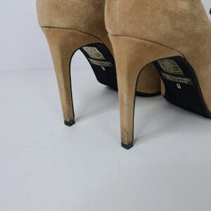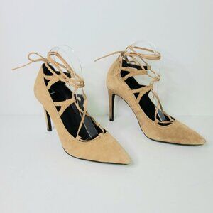 Jeffrey Campbelll Brielle Tan Suede Lace-Up Heels. Features neutral tan suede, tie-up detail, with a stiletto heel. Pointed toe. Sexy and neutral. Very tiny mark on exterior, wear to bottom of heels, see photos. Very good condition.