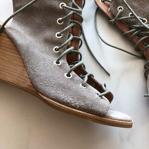 Luxe suede wedges styled with an open front and a heel cutout. Slim lace up ties. Stacked wedge and rubber sole. Leather: cowhide.