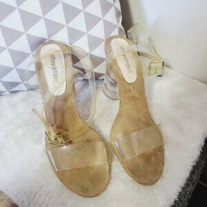 Stylish clear heels with a transparent strap. Tan sole adds a chic touch. Perfect for any occasion.