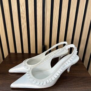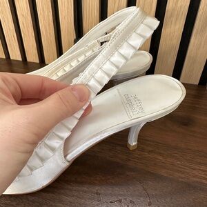 From Anthropologie, size 7.5 white jeffrey campbell kitten heel sling back wedding shoes. Worn once! Excellent used condition.