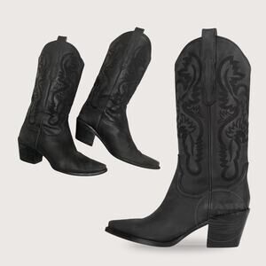 Sleek Western style with the Jeffrey Campbell Dagget Boot in Black Washed Leather — a bestselling silhouette that originally retailed for $325. This iconic design blends a feminine Western shape with bold black-on-black embroidery, a pointed toe, and a flattering stacked heel for that unmistakable JC look.