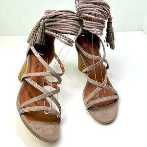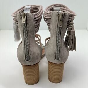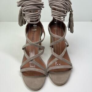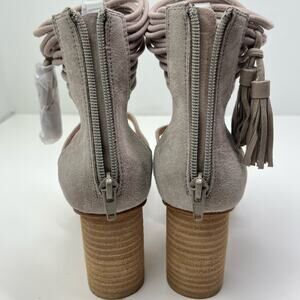 ITEM: Jeffrey Campbell Women's Despina Leather Taupe Tan Strappy Tassel Sandals - back zipper closure, decorative tassels