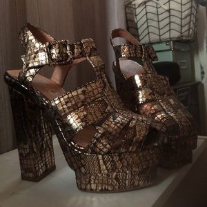One of a kind metallic gold, bronze and silver snakeskin platforms by Jeffrey Campbell.