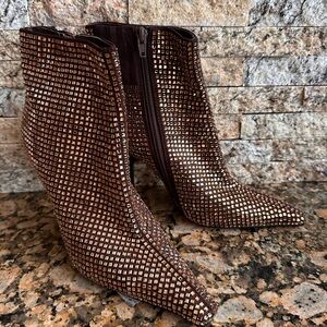 Jeffrey Campbell "Glammed" booties in bronze w/rhinestones over satin