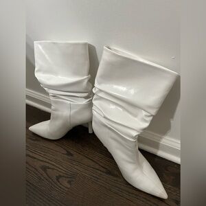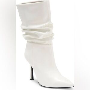 A slouched design distinguishes a chic boot balanced by a tapered heel and pointy toe.