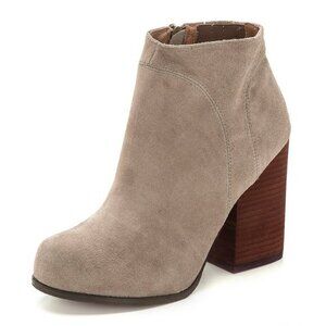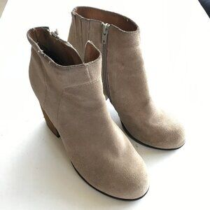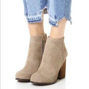 Jeffrey Campbell Distressed suede leather booties with a zip closure and elastic gusset at the inner side. A low, hidden platform adds a touch of height. This color is a nice creamy tan! Stacked heel and rubber sole.