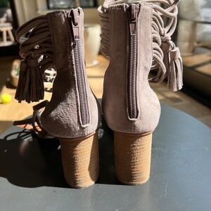 Jeffrey Campbell strappy heeled sandal in suede leather. Nude color, barley worn (2x), size 9 1/2, round wooden heel , height: 3 1/4"