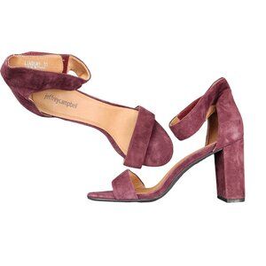 Jeffrey Campbell velvety smooth suede Lindsay open toe sandal with ankle strap, 3.5 inch heel in wine/maroon
