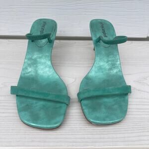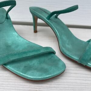 Tags: euc, anthro, anthropologie, prom, wedding guest, event, dressy, strappy, square toe, heels, formal, shoes, suede, teal green, blue, hera hi sandal, mint green, slip on style