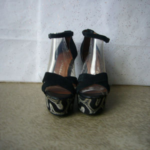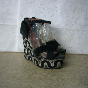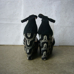 This Platform Wedge by Jeffrey Campbell is certainly one of a kind!!! Features a simple, classic criss cross style in Black suede with a closed heel and an adjustable ankle strap. The best part of this sandal is the Boho crochet covered wedge in a black and white pattern. Sky high heel of almost 5 inches but 2.25 inches in platform helps with that. Only worn a few times but some scuffs on front of shoe. Hard to find unique shoe perfect for festivals cause you can be taller and see past the crowd!