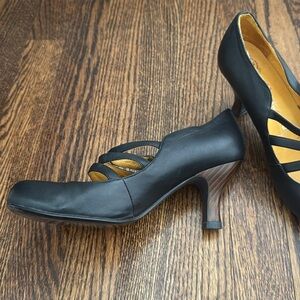 Jeffrey Campbell Ibiza black leather button strap wood grain heel Mary Jane shoe. Like new. Size 8 1/2. Heel height approximately 3 inches. Nonsmoking home.