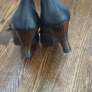 Jeffrey Campbell Ibiza black leather button strap wood grain heel Mary Jane shoe