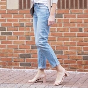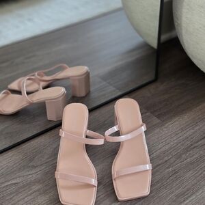Jeffrey Campbell Jamm-3 Jelly Slide Sandals in nude | blush patent. Features a modern square-toe, sleek double straps, and a chunky block heel. Minimalist and versatile, perfect for casual or dressy look.