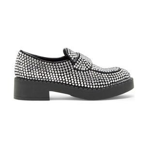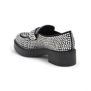 Rhinestones add eye-catching sparkle to a classic penny loafer with a retro-inspired block heel and platform.