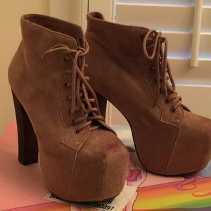Long laces secure a towering bootie with distressed wooden 4 3/4 heel that contrast amazingly with the soft upper taupe suede. 2 1/2 hidden platform. 4” boot shaft. Man made sole. Size 6, but could fit 6.5. Perfect condition! Sold out everywhere! Please check my styling pics with the Lita bootie on my other listings.