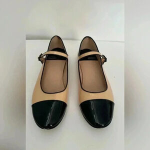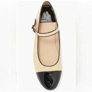 Aboldly colorblocked cap toe lends striking contrast to a sleek mary jane flat crafted from glossy patent leather