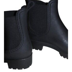 Jeffrey Campbell matte black rubber Chelsea-style rain boots with chunky lug soles and elastic gore sides, giving a minimalist-grunge and streetwear-ready look that works with leggings, straight-leg jeans, and oversized knits for rainy days. Slip-on pull tabs and platform lug soles add both practicality and a bit of height while keeping the vibe edgy and utilitarian.