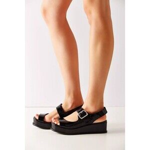 The Jeffrey Campbell Mirador Flatform Sandals feature a modern and edgy design perfect for adding height and style to your outfit. Crafted from glossy black patent leather, these flatform sandals offer both fashion and comfort. They have an adjustable buckle strap ensuring a secure fit, making them a versatile addition to your footwear collection.
