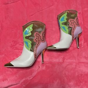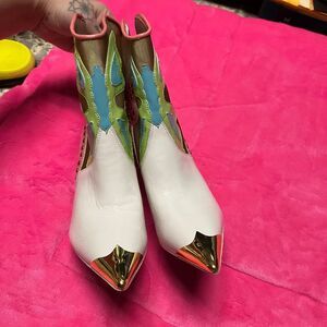 Step out in style with these stunning Jeffrey Campbell Western boots in white, gold, and multi-color. These boots are perfect for any occasion, be it a party or casual outing. The pointed toe shape and stiletto heel style give a chic and trendy look while the pull-on closure makes it easy to wear.