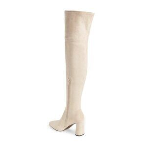 Details & careA slender block heel and softly pointed toe liven up this thigh-high boot that makes every step feel like a commanding pose.