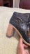 These are kind of a cross between a sandal and a boot. They’re beautiful, black laser, cut, leather, beautiful, intricate detail a wood block heel. Pepto, February 2025 spring in excellent condition.