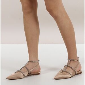 Fabric shoe with ankle and back strap. Rhinestones on the upper. Rubber sole. Heel height 20mm